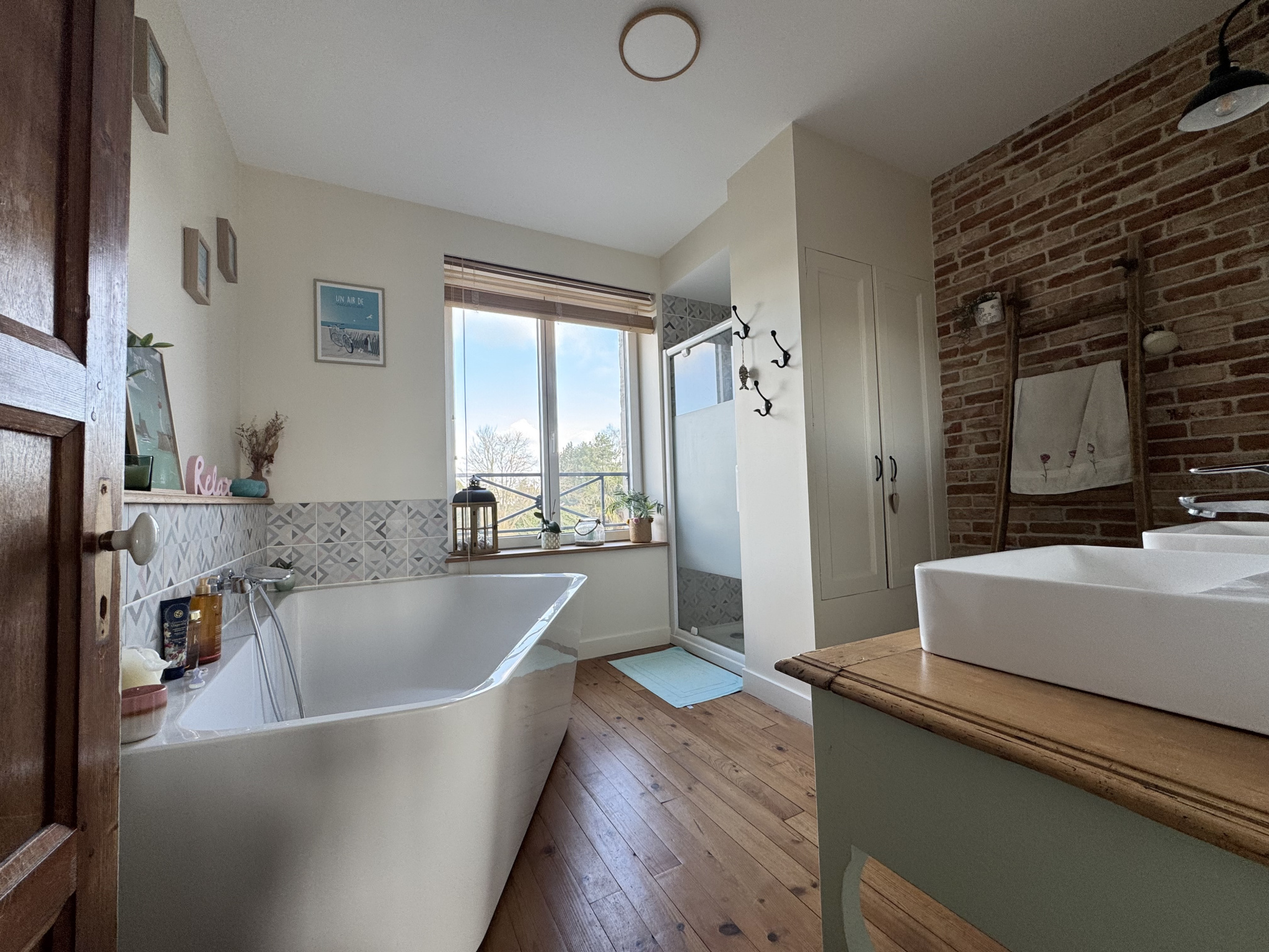 - Une salle de bains d'environ 9m2 avec douche et baignoire.