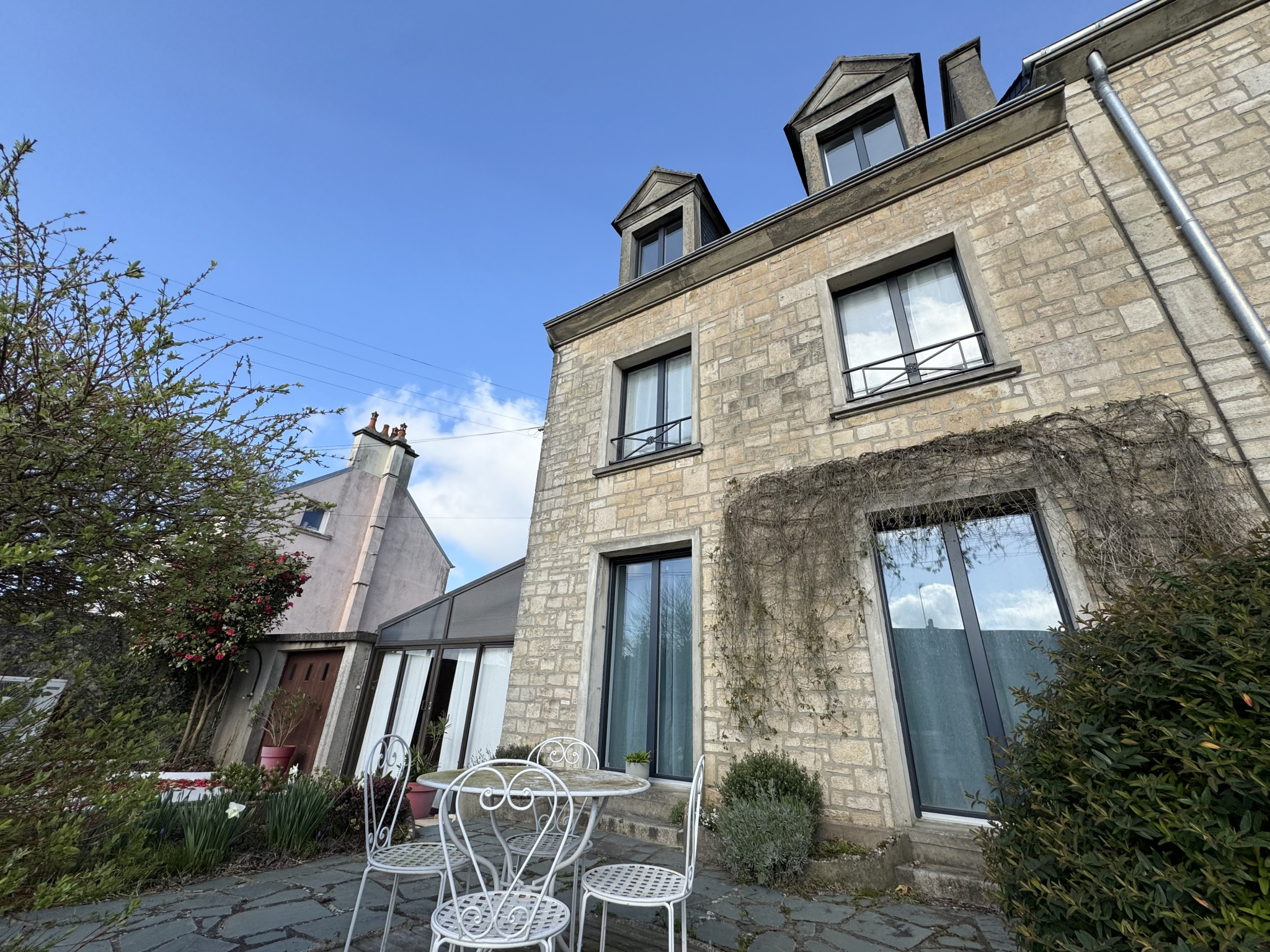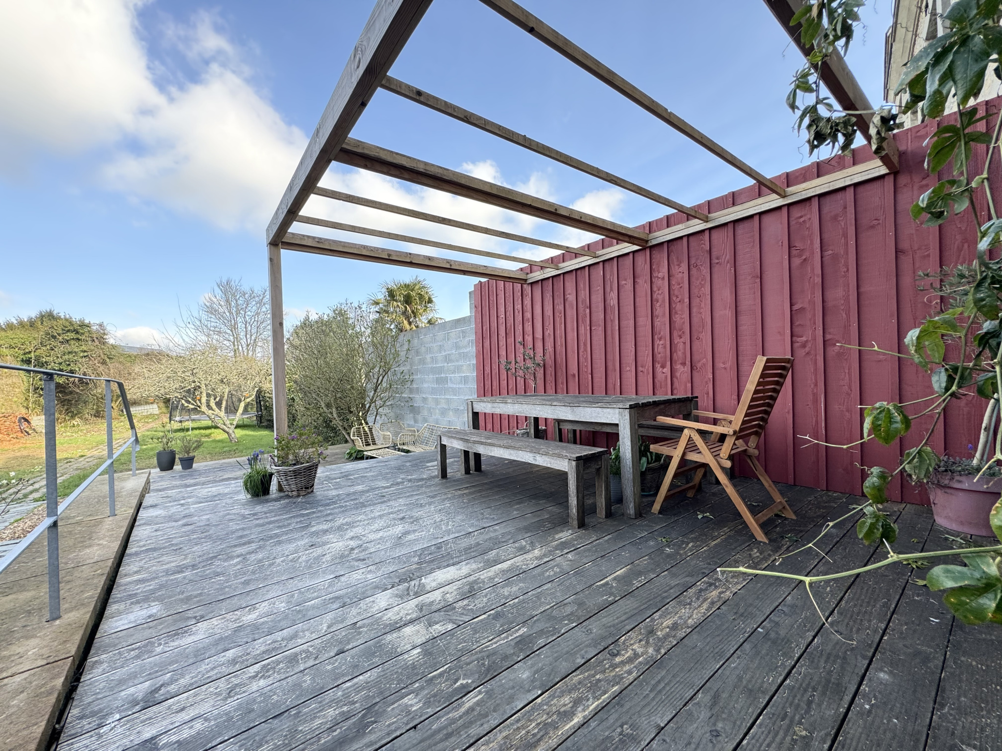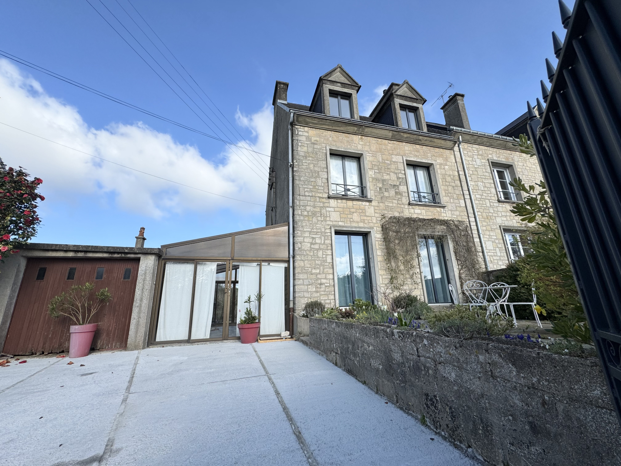 - Une grande véranda fait la jonction entre l'entrée de la maison et le garage.