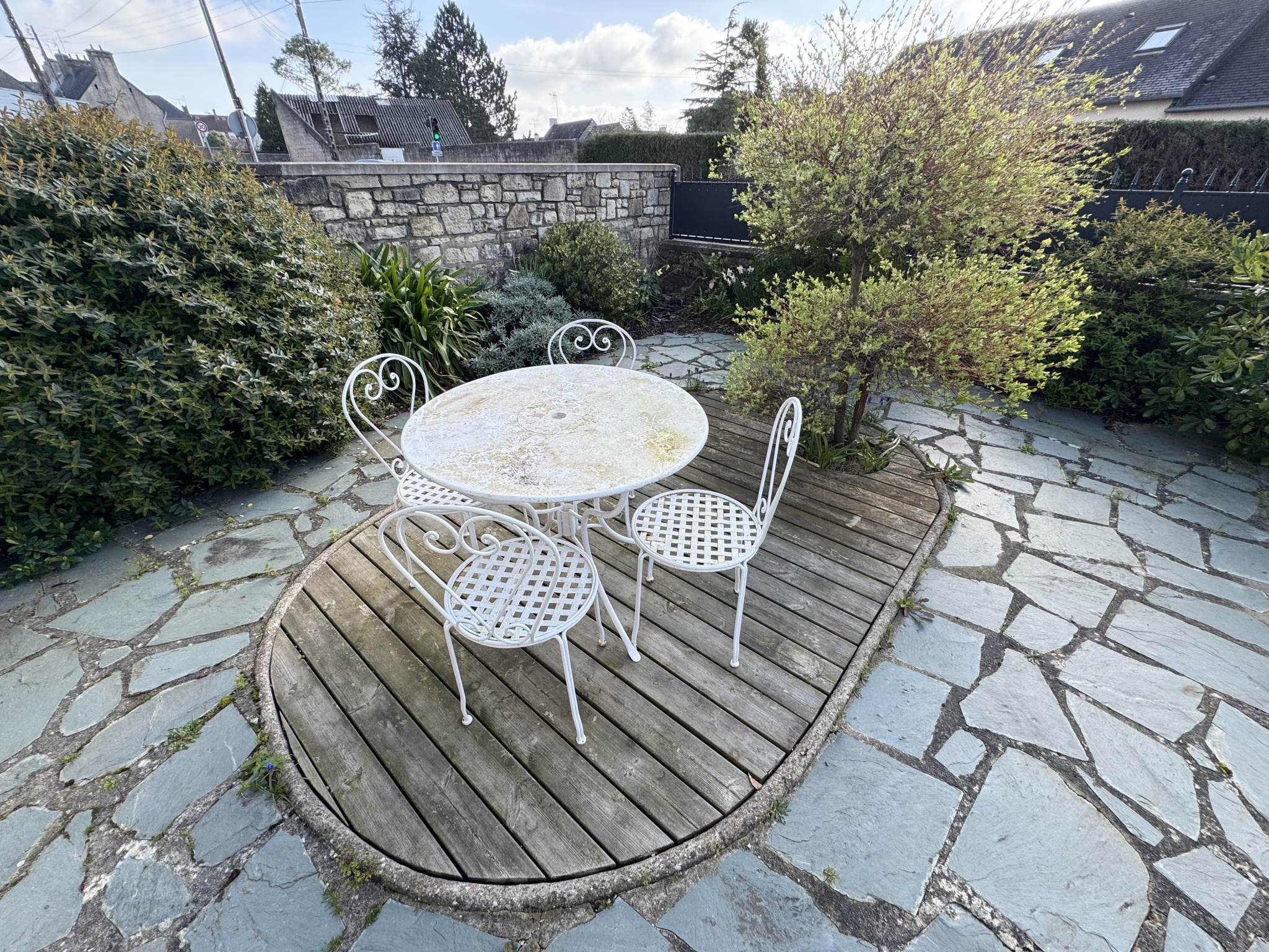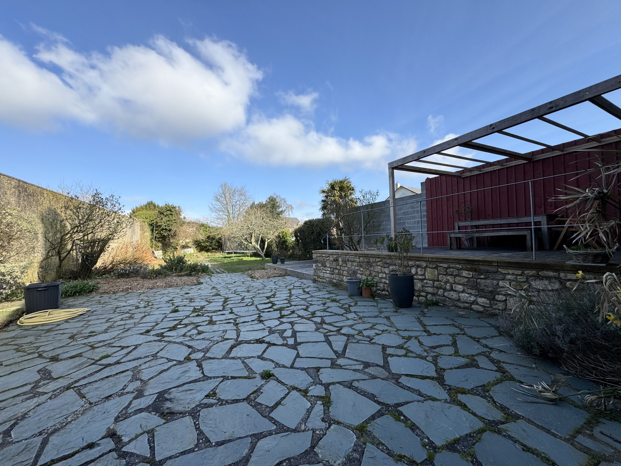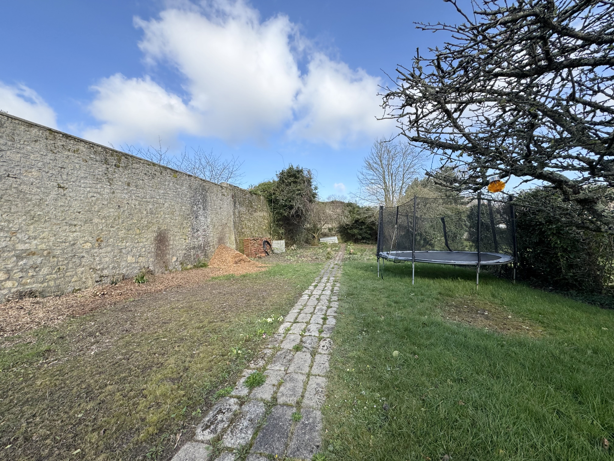 - Beau jardin arboré et clos de haies et de murs sur l'arrière de la maison.