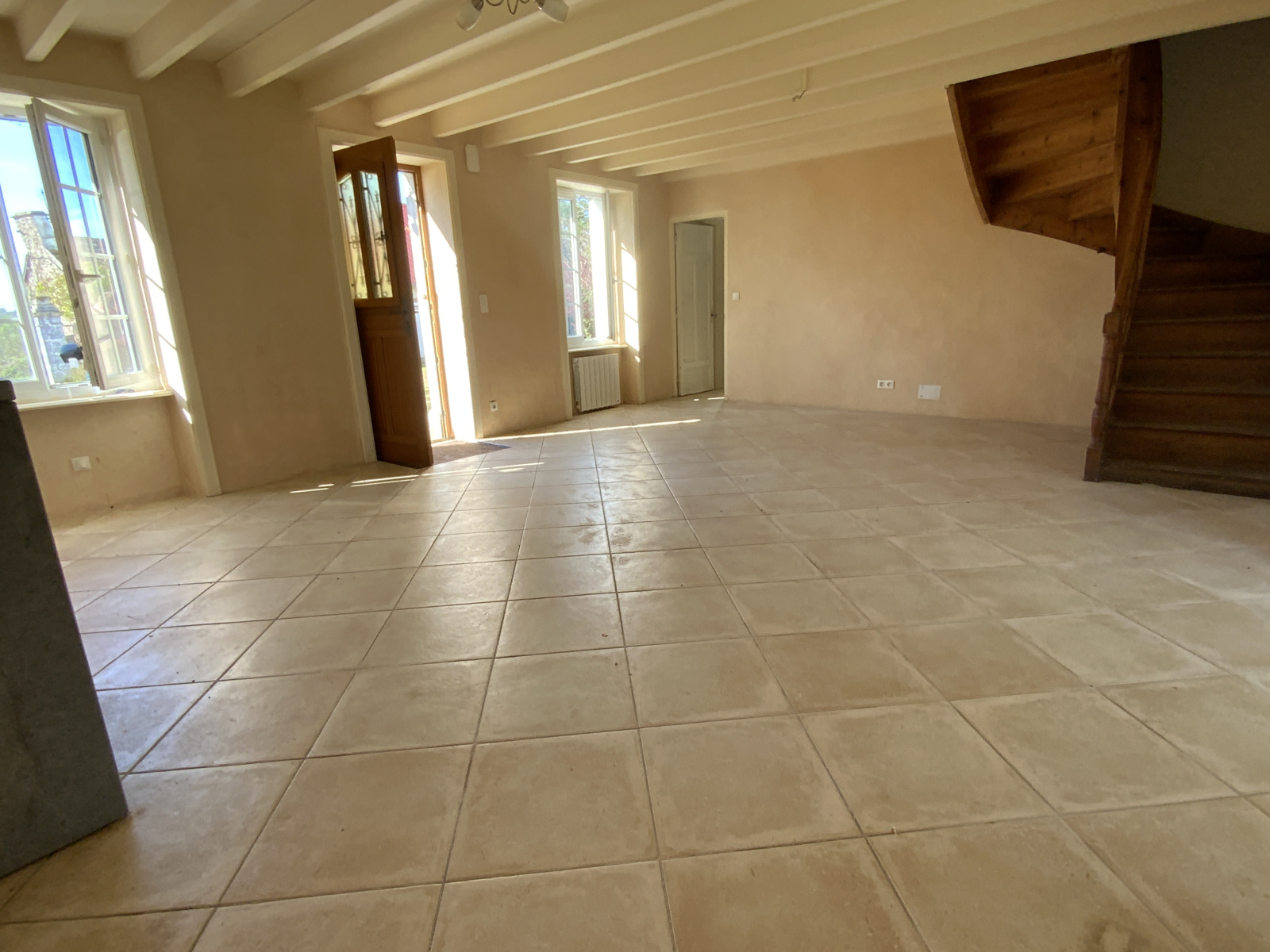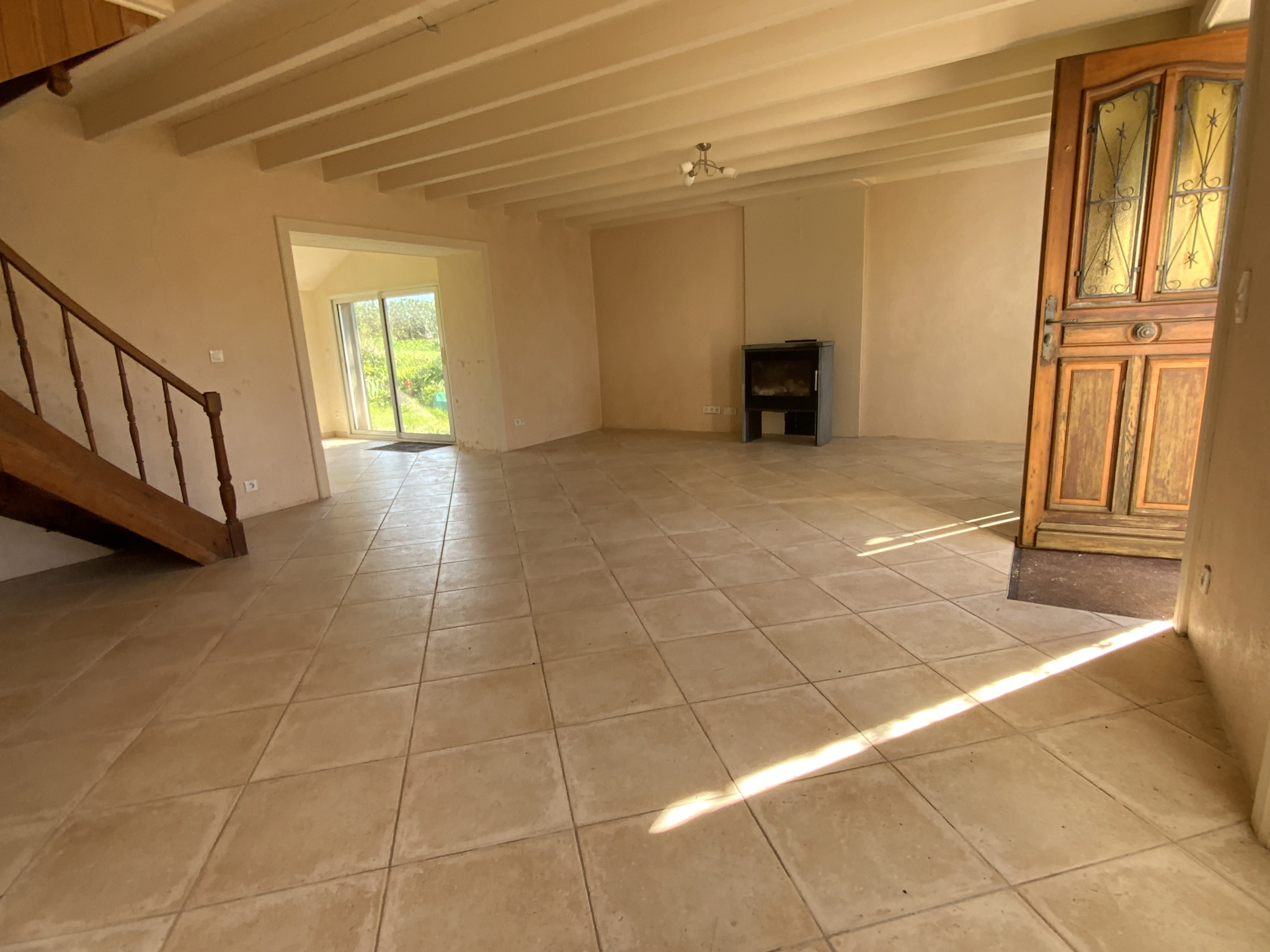 - Un vaste séjour/salon d'environ 37m2 avec son poêle à bois et ses murs enduits en chaux-chanvre.