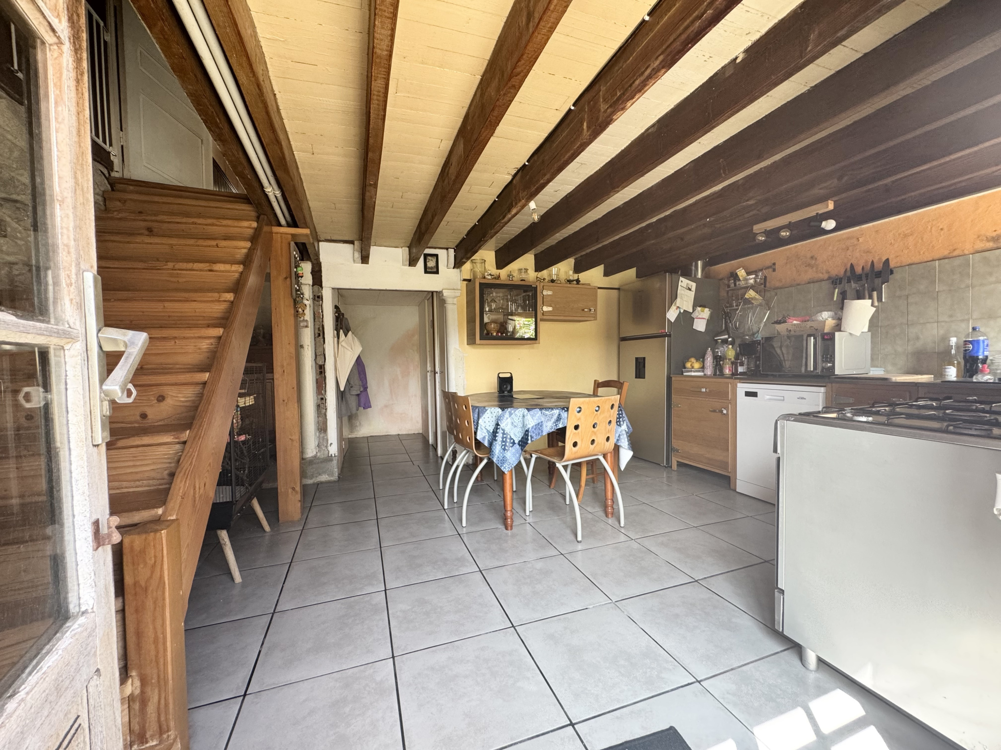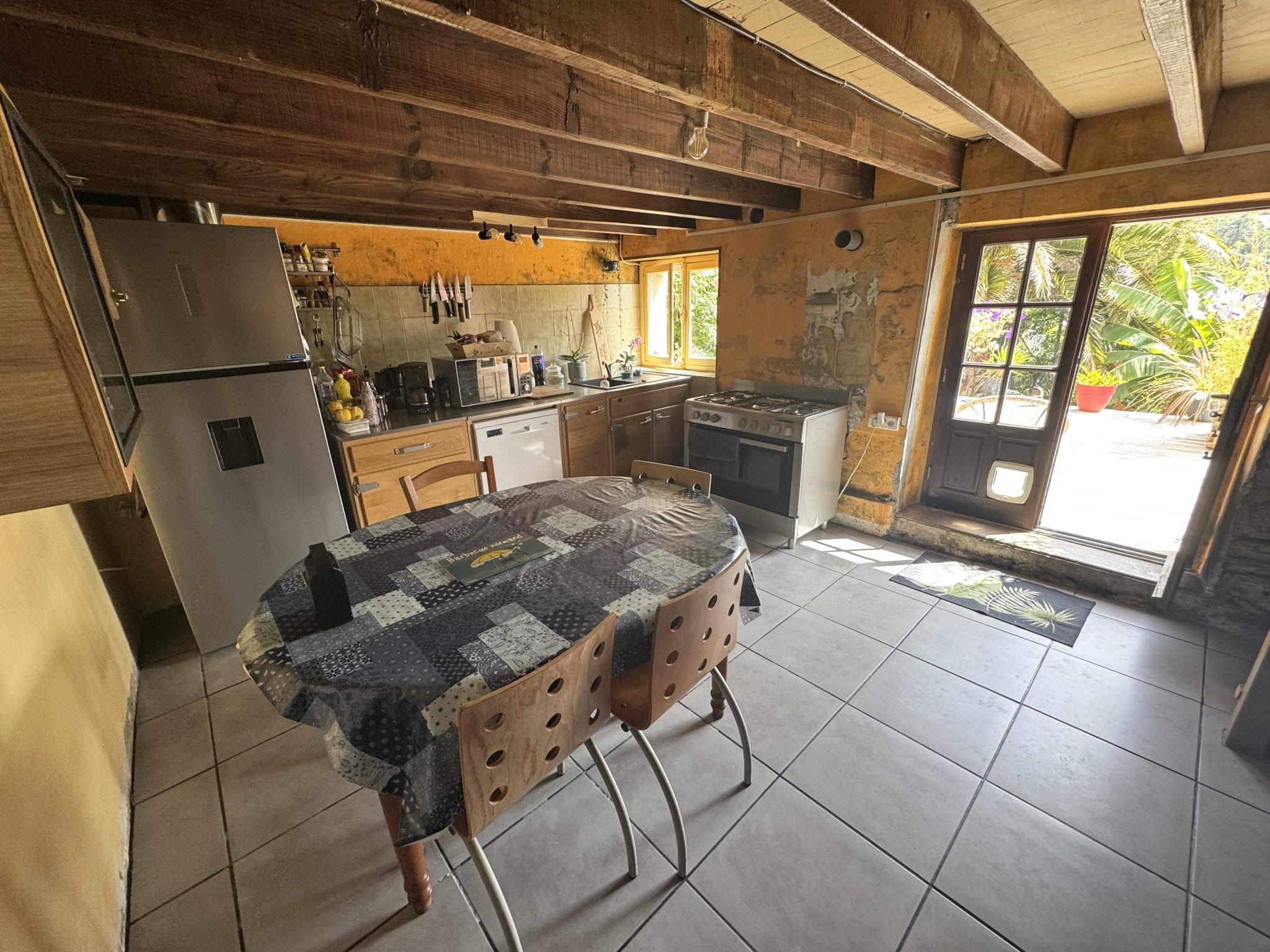 - Une cuisine/coin repas avec porte vitrée donnant sur la terrasse et le jardin.