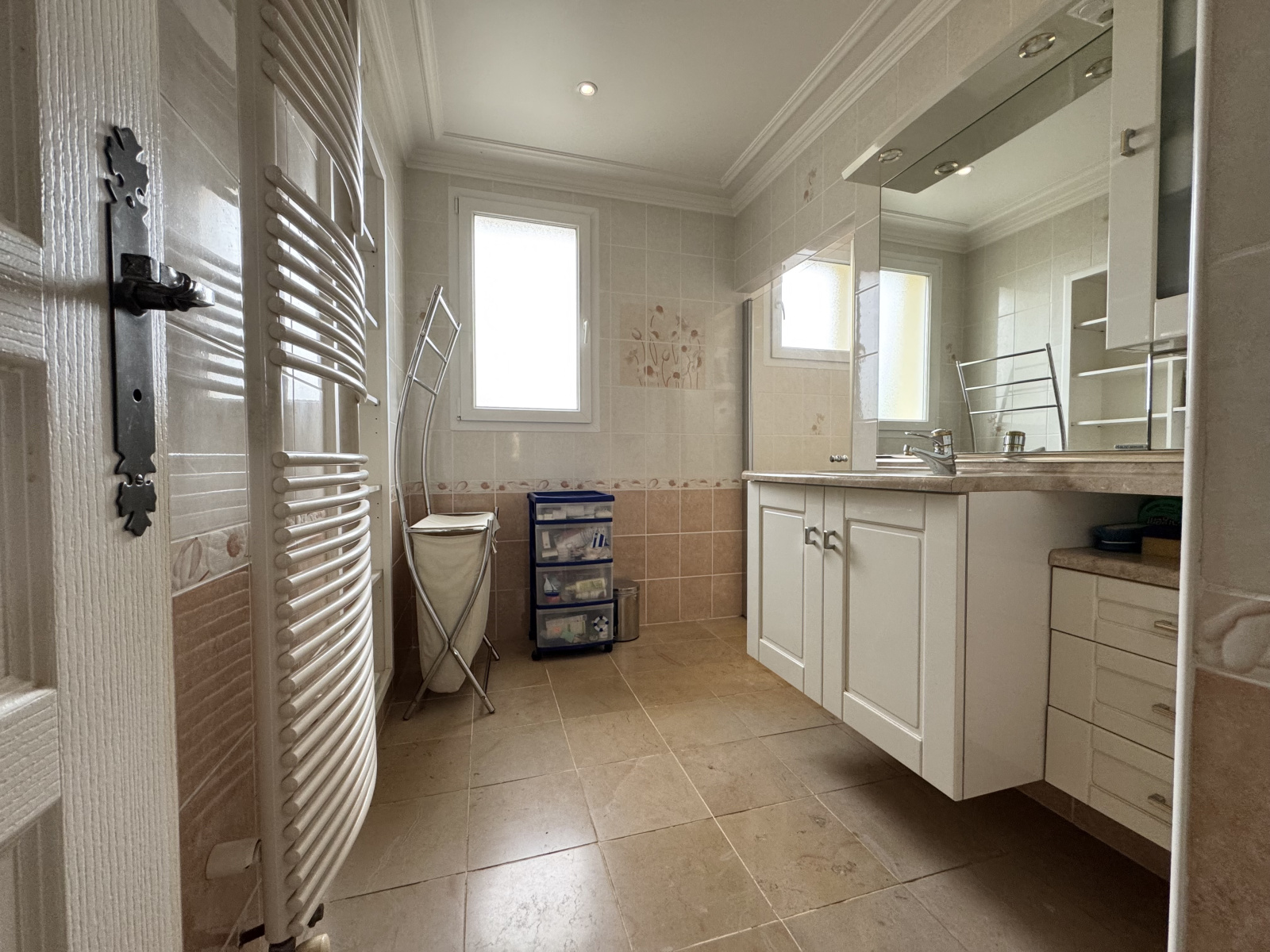 - Un grand séjour lumineux avec son sol en travertin et son retour pour un salon plus cosy.